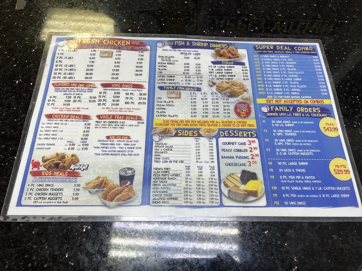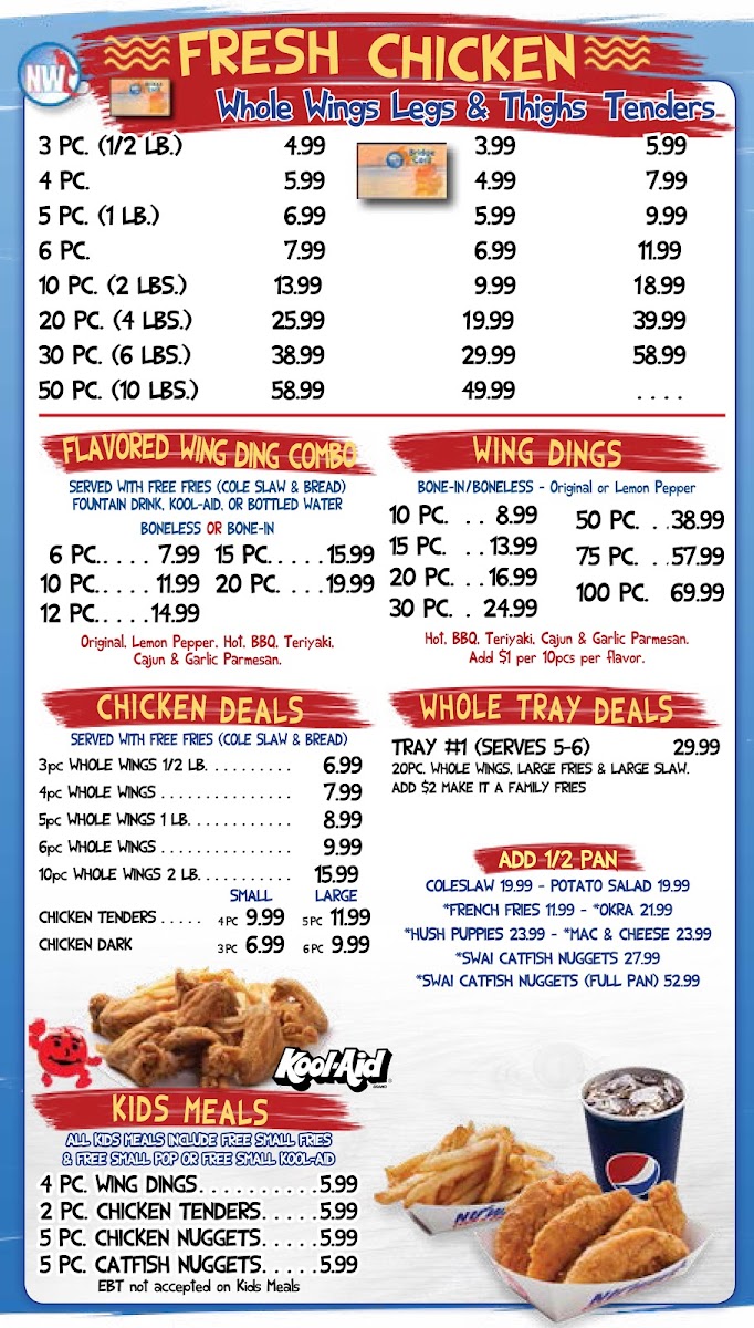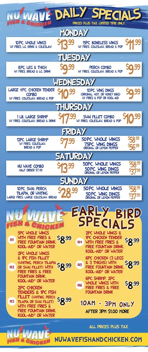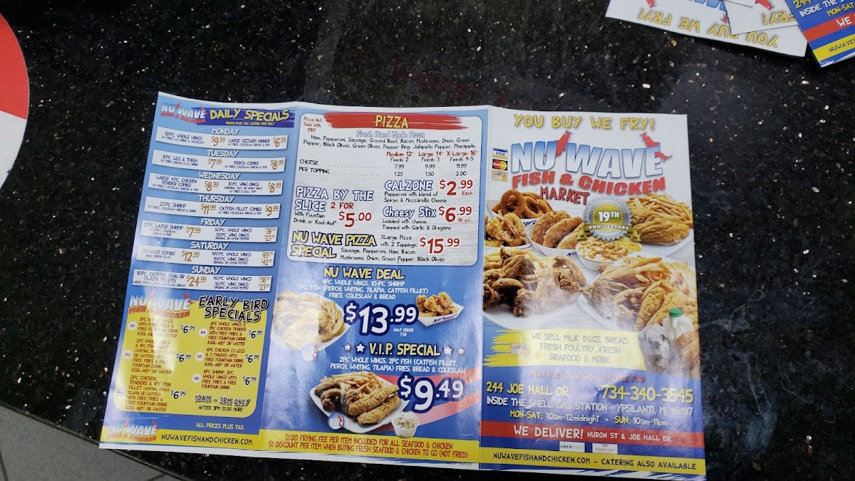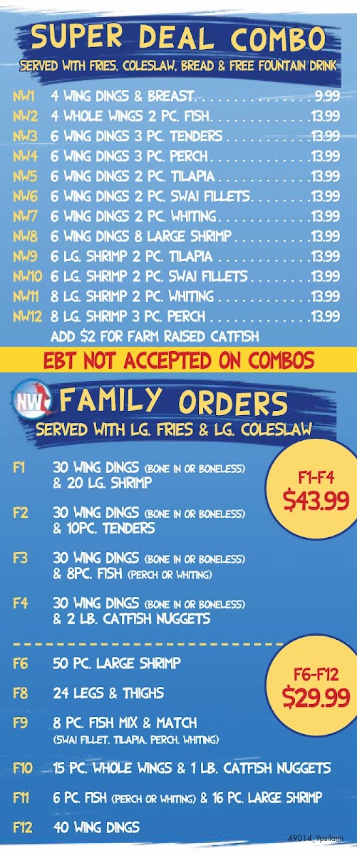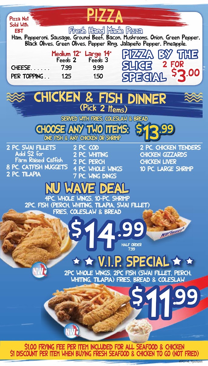 Welcome to Nu Wave Fish and Chicken, where flavor meets freshness in Ypsilanti, MI. Known for its deliciously crispy fried fish and chicken, Nu Wave serves up a fantastic variety of dishes that cater to all tastes. The menu features enticing early bird specials like 5 Pc Whole Wings and 2 Pc Fish Fillet, served with fries and a complimentary drink, making it a perfect choice for lunch. For those seeking hearty meals, the Super Deal Combos offer a delightful mix of wing dings, tenders, and fried fish, all with sides like fries and slaw.